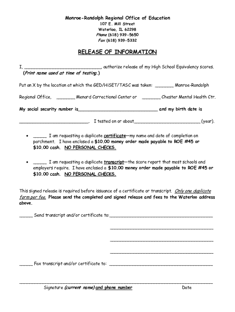 Monroe Randolph Regional Office of Education 107 E. Mill Street Waterloo, IL 62298 Phone (618) 9395650 Fax (618) 9395332RELEASE OF INFORMATION I, authorize release of my High School Equivalency scores.