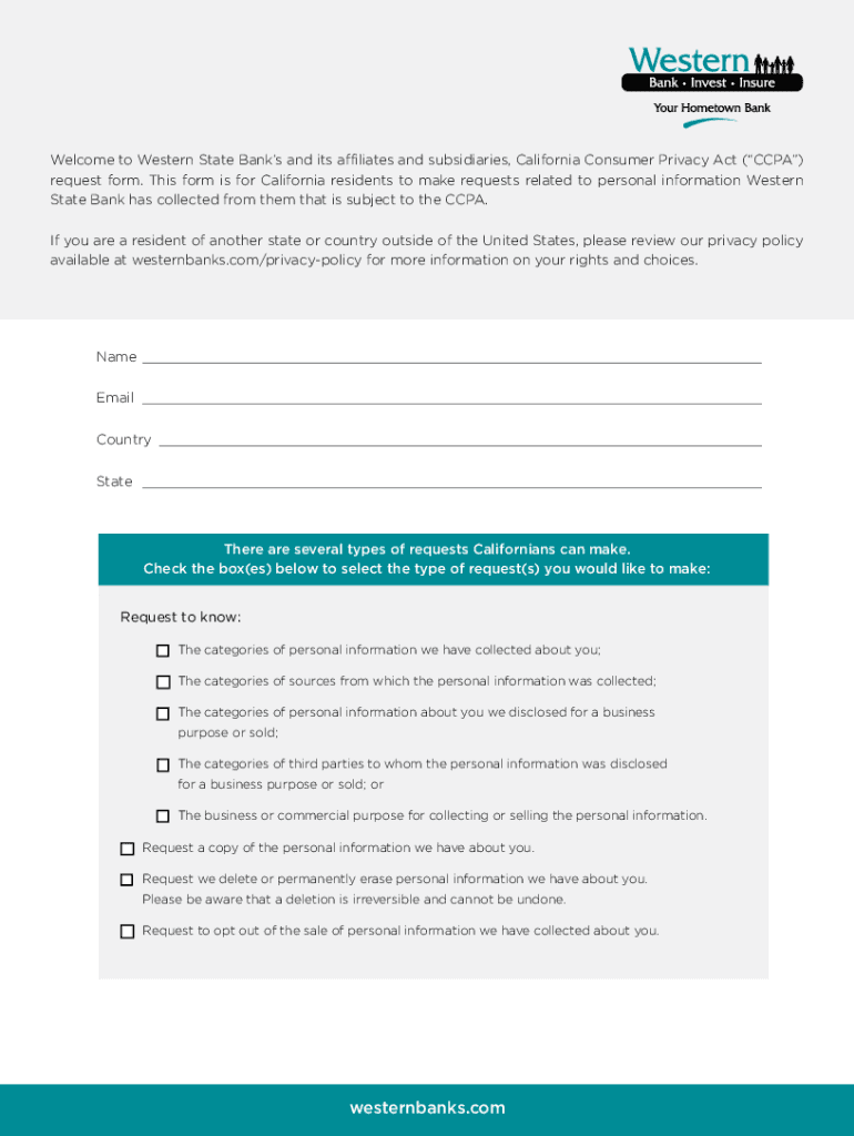 Welcome to Western State Banks and its affiliates and subsidiaries, California Consumer Privacy Act (CCPA) request form. This form is for California residents to make requests related to personal