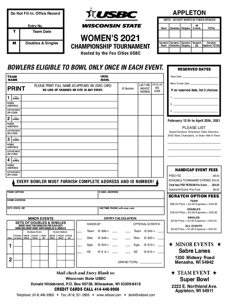 Appleton Not Fill In. Office Recondite DO NOT WRITE IN THESE SPACESEntry No. Teamed DateTWomens 2021Doubles & SinglesMDoubles Singles EventsTOTALScratch Scratch Team Doubles Singles AE Options TOTALCHAMPIONSHIP