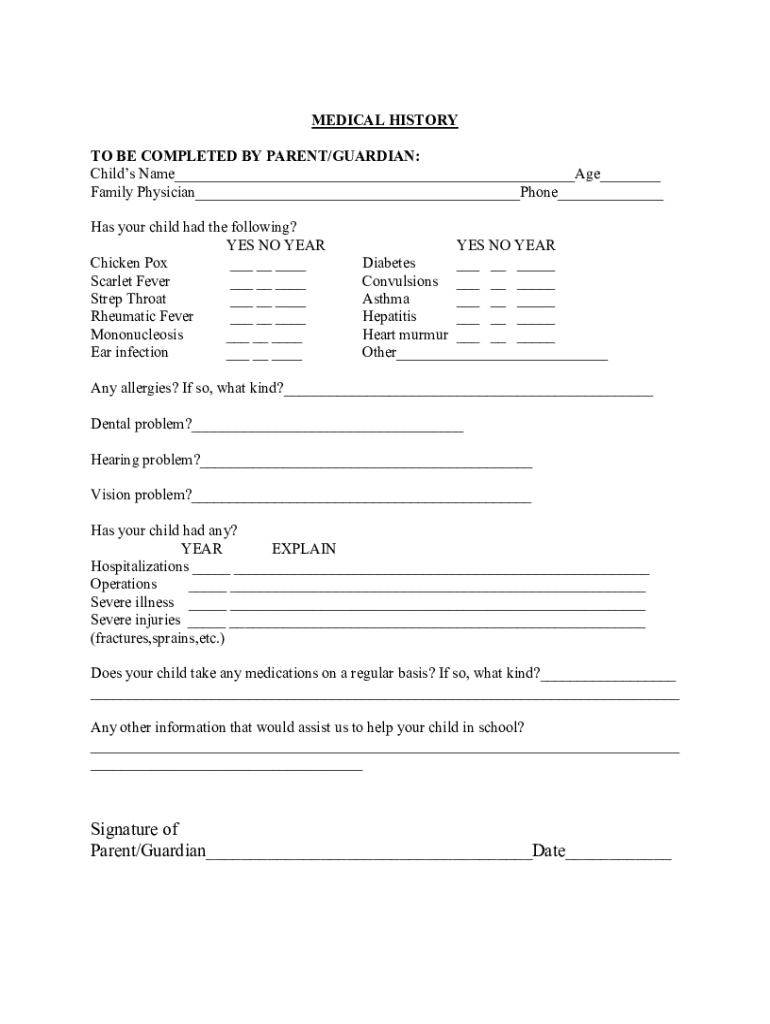 MEDICAL HISTORY TO BE COMPLETED BY PARENT/GUARDIAN: Child's Name Age Family Physician Phone Has your child had the following? YES NO YEAR Chicken Pox Scarlet Fever Strep Throat Rheumatic Fever Mononucleosis