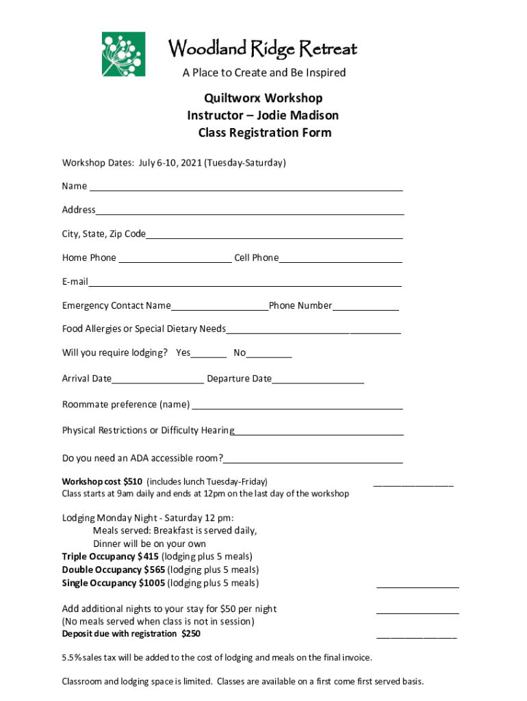 Woodland Ridge Retreat A Place to Create and Be Inspired AQuiltworx Workshop Instructor Jodie Madison Class Registration Form Workshop Dates: July 610, 2021 (Tuesday Saturday) Name Address City, State,