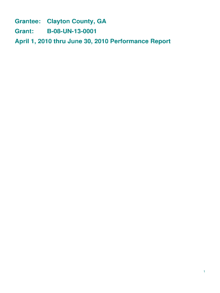 Grantee: Clayton County, GA Grant: B-08-UN-13-0001 April 1, 2010, through June 30, 2010, Performance Report 1 Grant Number: Obligation Date: B-08-UN-13-0001 Grantee Name: Award Date: Clayton County,