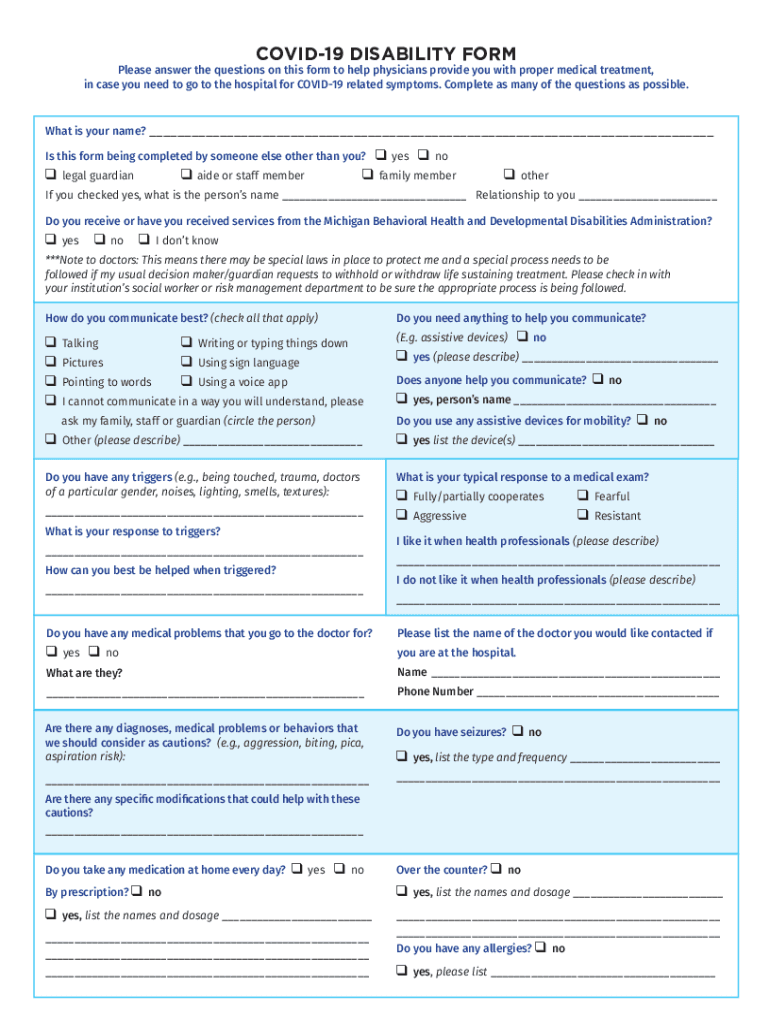 COVID-19 DISABILITY Formulas answer the questions on this form to help physicians provide you with proper medical treatment, in case you need to go to the hospital for COVID-19 related symptoms. Complete