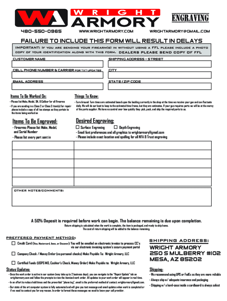Engraving 4805500965www. Wright armory.comwrightarmory Gmail.com failure to include this form will result in delays customer name shipping address streetcar phone number & Carrier for TXT updatescityemail