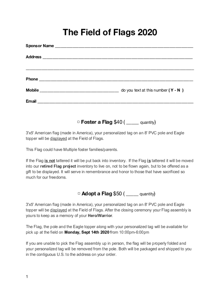 The Field of Flags 2020 Sponsor Name Address Phone Mobile do you text at this number (Y N) Email Foster a Flag $40 (quantity) 3 'x5 American flag (made in America), your personalized tag on an 8 PVC