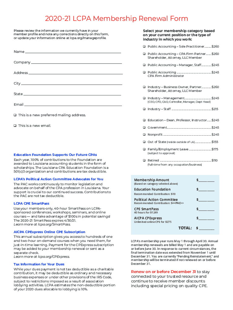 202021 CPA Membership Renewal Form Select your membership category based on your current position or the type of industry in which you work:Please review the information we currently have in your