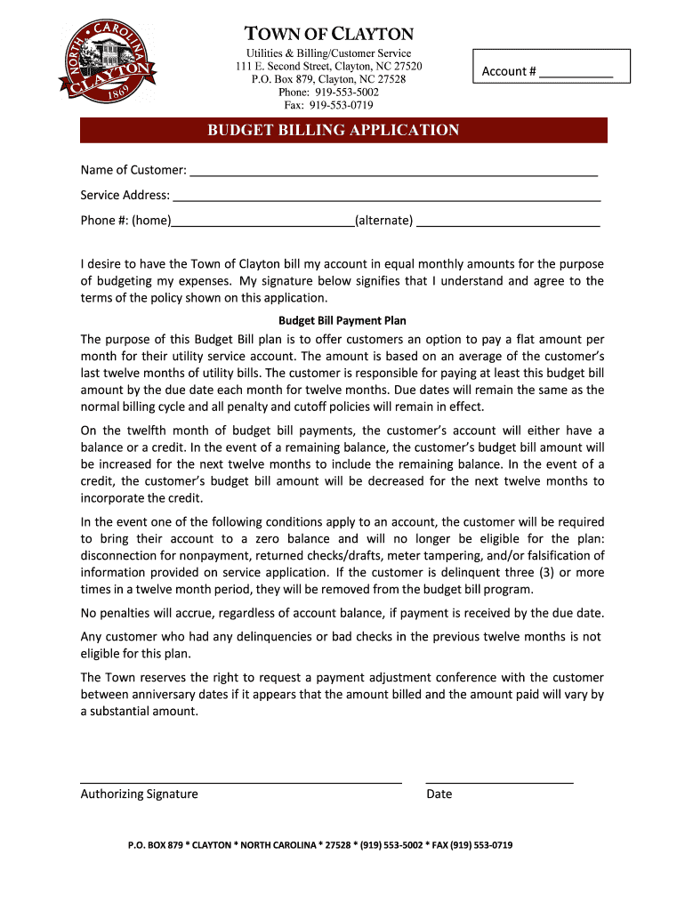 TOWN OF CLAYTON Utilities & Billing/Customer Service 111 E. Second Street, Clayton, NC 27520 P.O. Box 879, Clayton, NC 27528 Phone: 9195535002 Fax: 9195530719 Account # BUDGET BILLING APPLICATION