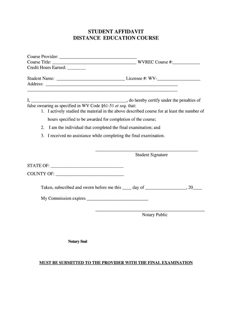 This affidavit is intended for students currently enrolled in distance education courses in West Virginia. Students must be able to certify that they have completed the course materials and final examination independently.