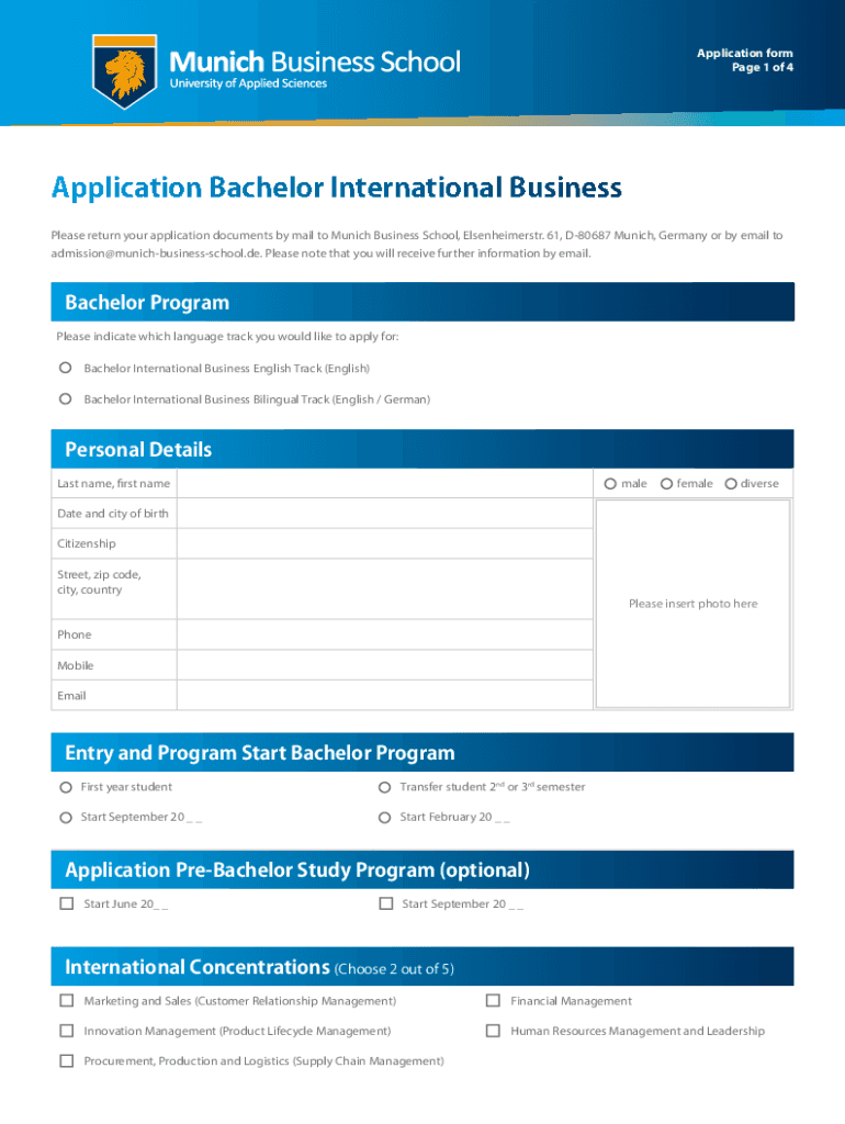 Please return your application documents by mail to Munich Business School, Elsenheimerstr. 61, D80687 Munich, Germany or by