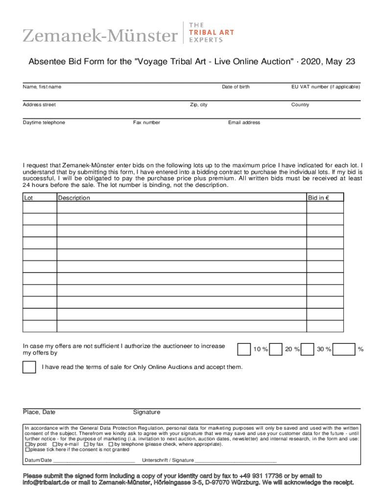 Absentee Bid Form for the “Voyage Tribal Art Live Online Auction 2020, May 23 Name, first namesake of birthAddress street EU VAT number (if applicable)Zip, cityDaytime telephone numberCountryEmail