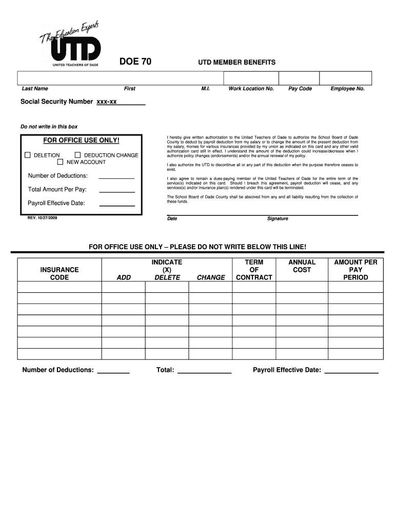 Employees who are members of the United Teachers of Dade and wish to authorize payroll deductions for union-provided insurance are eligible to use this form.