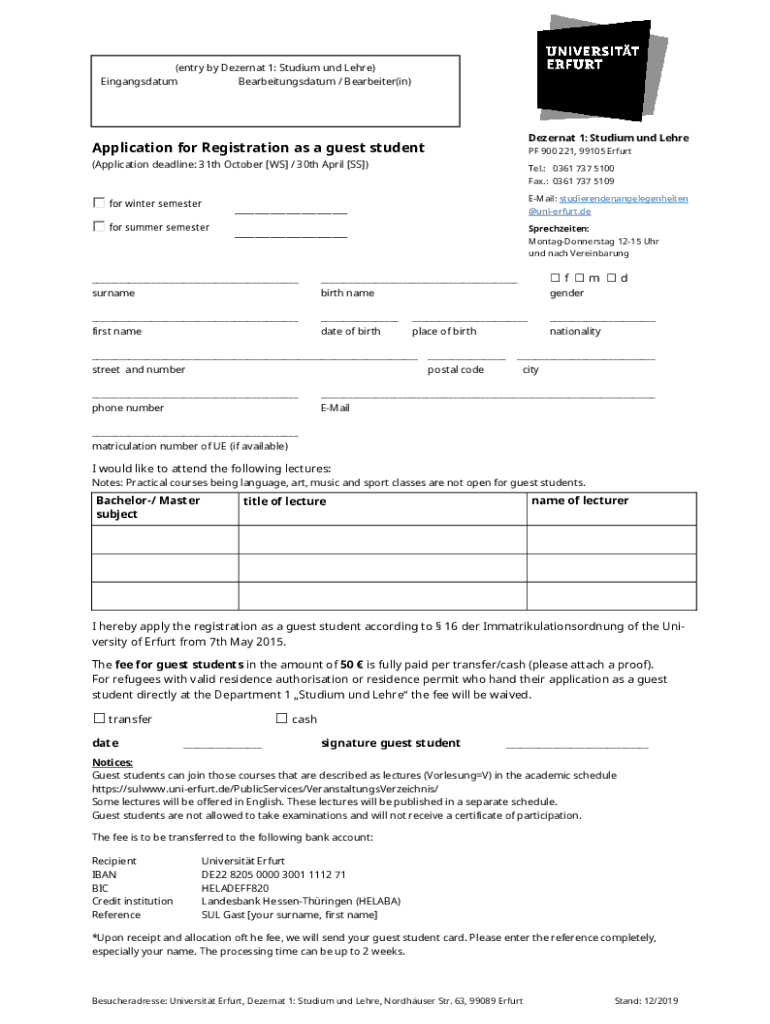 (entry by Defeat 1: Stadium UND Were) Eingangsdatum Bearbeitungsdatum / Thereafter(in)Defeat 1: Stadium UND Reapplication for Registration as a guest students 900 221, 99105 Erfurt(Application deadline:
