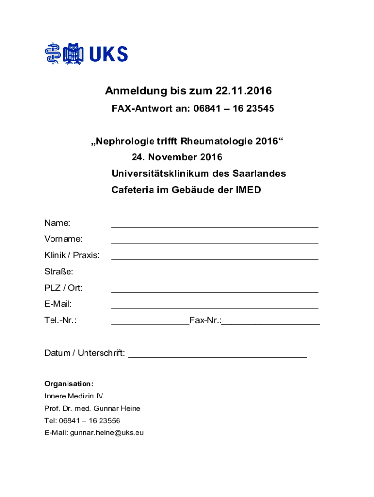 Amending bis sum 22.11.2016 FAXAntwort an: 06841 16 23545Nephrologie drift Rheumatologist 2016 24. November 2016 Universittsklinikum DES Saarland Cafeteria I'm Elude her Immediate: Surname: Link /
