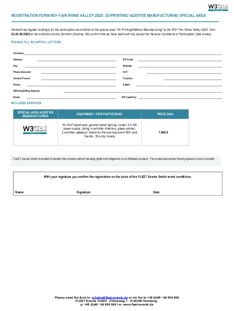 REGISTRATION FORM W3+ FAIR RHINE VALLEY 2020: 3DPRINTING/ ADDITIVE MANUFACTURING SPECIAL AREA Herewith we register blindingly for the participation as exhibitor at the special area “3D Printing/Additive