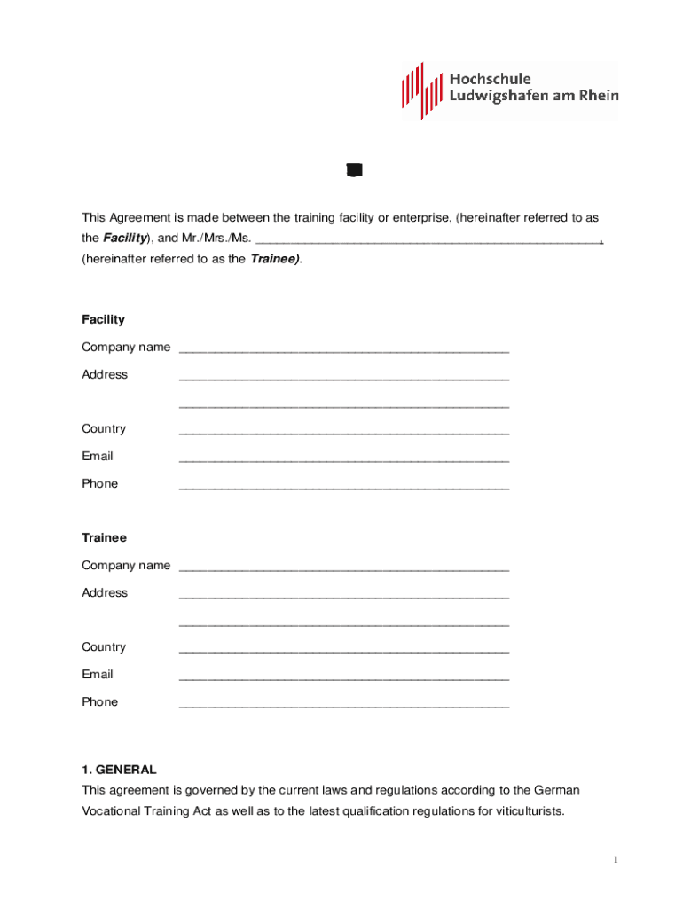 S U T D N E R IG A M This Agreement is made between the training facility or enterprise, (hereinafter referred to as the Facility), and Mr./Mrs./Ms., (hereinafter referred to as the Trainee). Facility