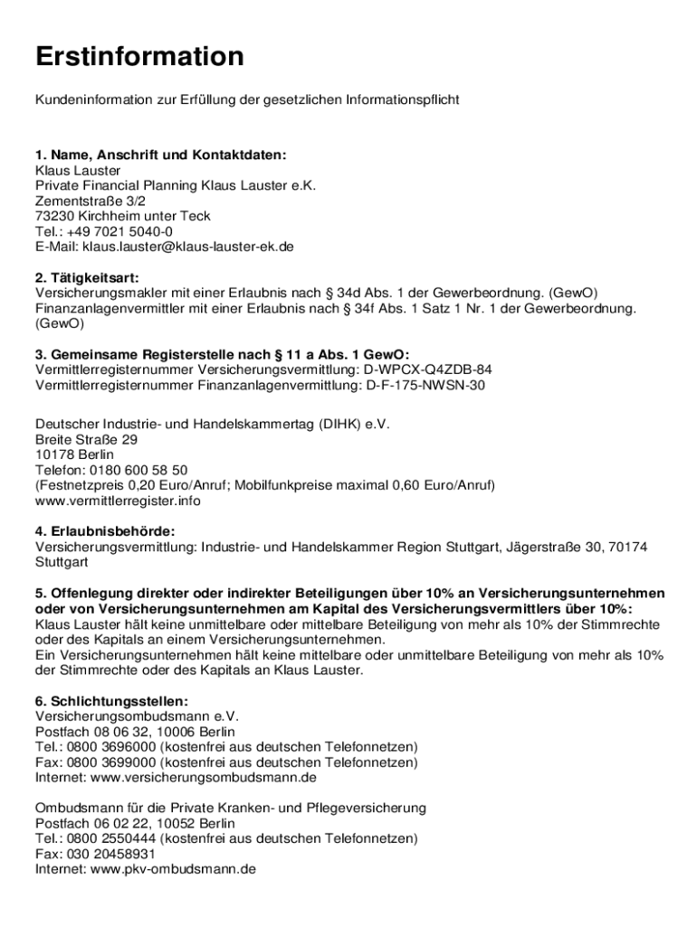 Erst information Kundeninformation our Rolling her gesetzlichen Informationspflicht1. Name, Antichrist UND Kontaktdaten: Klaus Luster Private Financial Planning Klaus Luster e.K. Zementstrae 3/2 73230