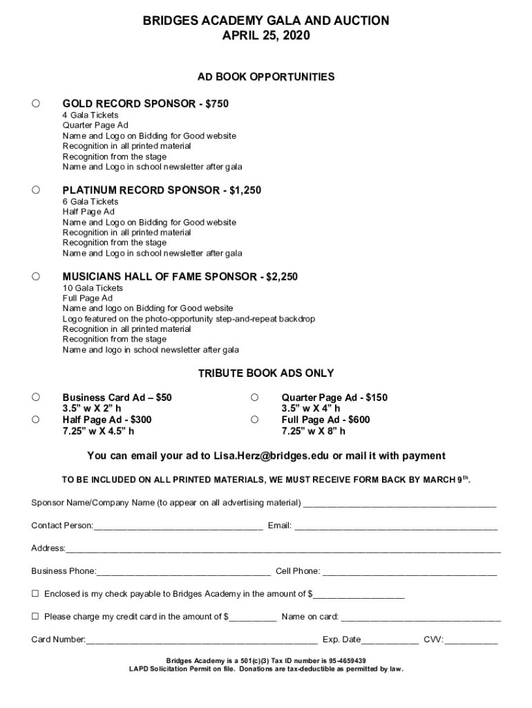 BRIDGES ACADEMY GALA AND AUCTION APRIL 25, 2020, AD BOOK OPPORTUNITIES GOLD RECORD SPONSOR $750 4 Gala Tickets Quarter Page Ad Name and Logo on Bidding for Good website Recognition in all printed