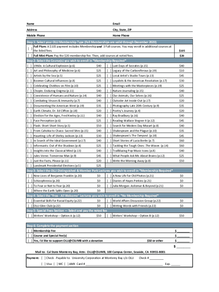 NameEmailAddressCity, State, ZIP Mobile Phoneme Honester 1: Select your OLLIE Membership Type (Fall Memberships are valid through December 2020) Fall Plum: A $105 payment includes Membership and 3