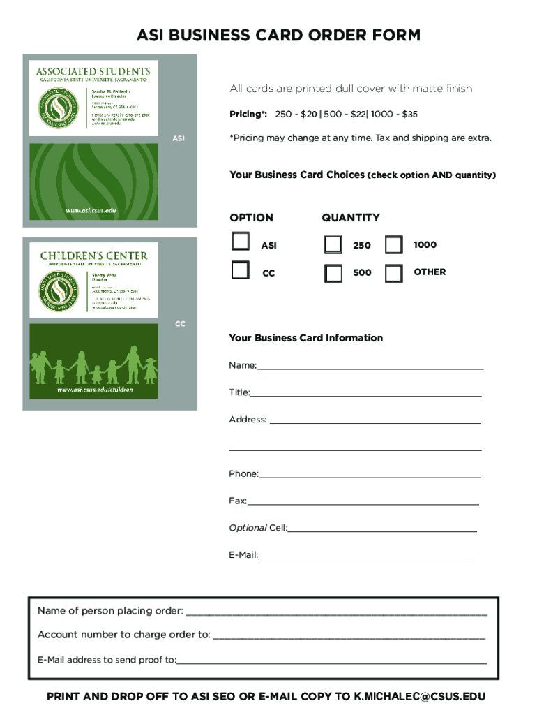 AS BUSINESS CARD ORDER FORM All cards are printed dull cover with matte finish Pricing*: $$$2502050022100035 AS×Pricing may change at any time. Tax and shipping are extra. Your Business Card Choices