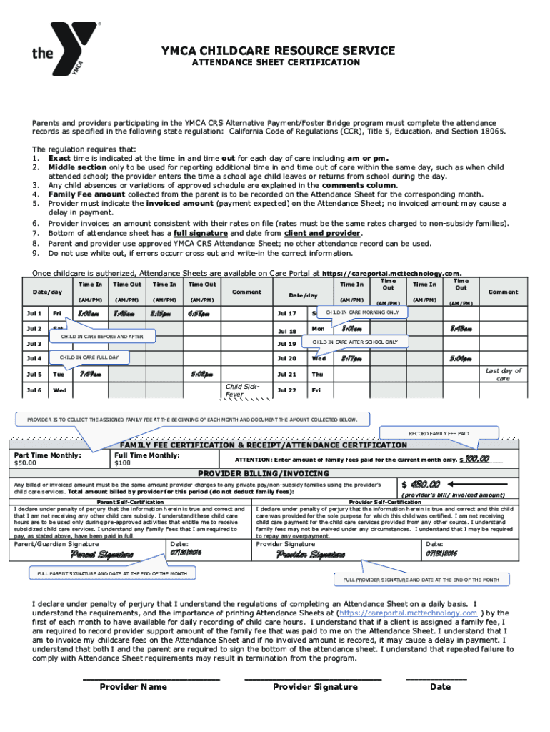 ATTENDANCE SHEET CERTIFICATIONParents and providers participating in the YMCA CRS Alternative Payment/Foster Bridge program must complete the attendance