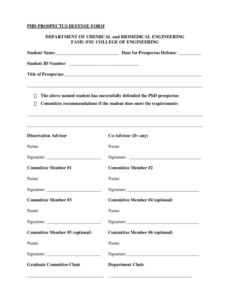 PhD PROSPECTUS DEFENSE FORM DEPARTMENT OF CHEMICAL and BIOMEDICAL ENGINEERING FAMOUS COLLEGE OF ENGINEERING Student Name: Date for Prospectus Defense: Student ID Number: Title of Prospectus: The above