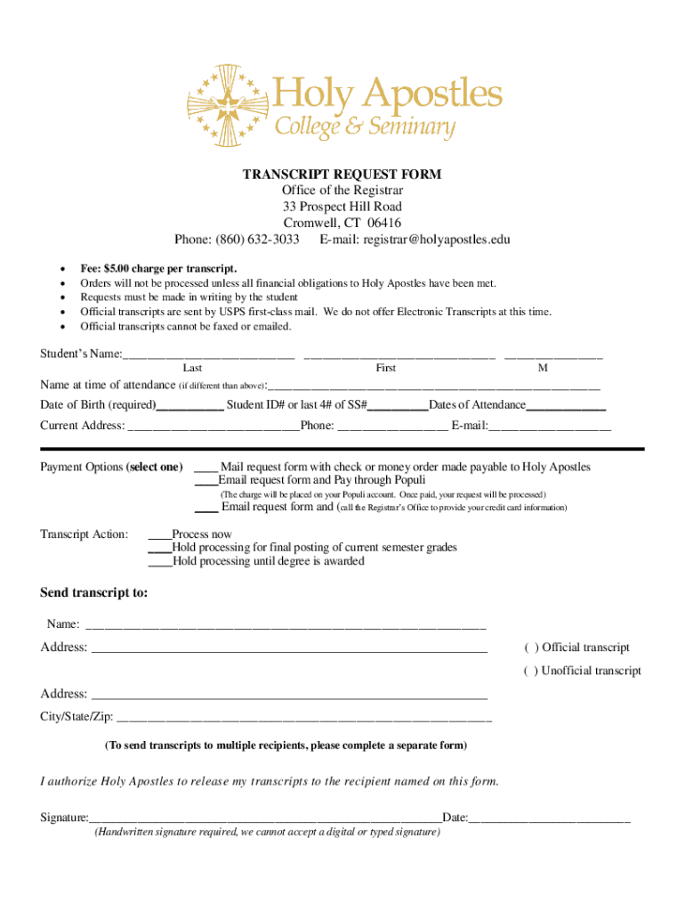 TRANSCRIPT REQUEST FORM Office of the Registrar 33 Prospect Hill Road Cromwell, CT 06416 Phone: (860) 6323033 Email: registrar holy apostles.edu Fee: $5.00 charge per transcript. Orders will not be