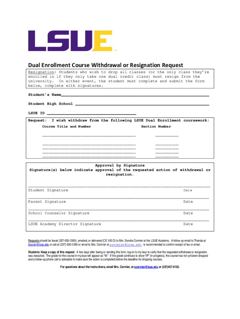 Dual Enrollment Course Withdrawal or Resignation Request Resignation: Students who wish to drop all classes (or the only class they're enrolled in if they only take one dual credit class) must resign