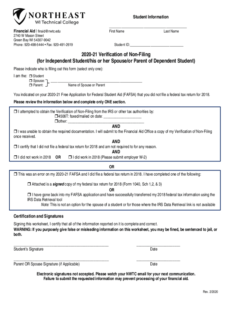 Student Information Financial Aid fin aid WTC.edu2740 W Mason Street Green Bay WI 543079042 Phone: 9204985444 Fax: 9204912619 First Name Last Name Student ID: 202021 Verification of Confining (for