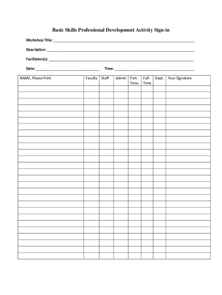 Basic Skills Professional Development Activity Signing WorkshopTitle: Description: Facilitator(s): Date: Time: NAME, Greasepaint Faculty Staff Admin Part Time Full Dept. YourSignature Time.