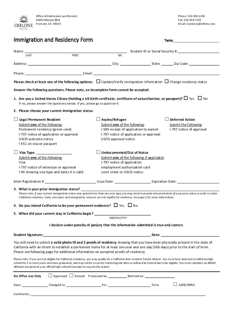 Office of Admissions and Records 43600 Mission Blvd. Fremont, CA 94539Phone: 5106596100 Fax: 5106597321 Email: residency oh lone. Immigration and Residency Former:Name:Student ID or Social Security