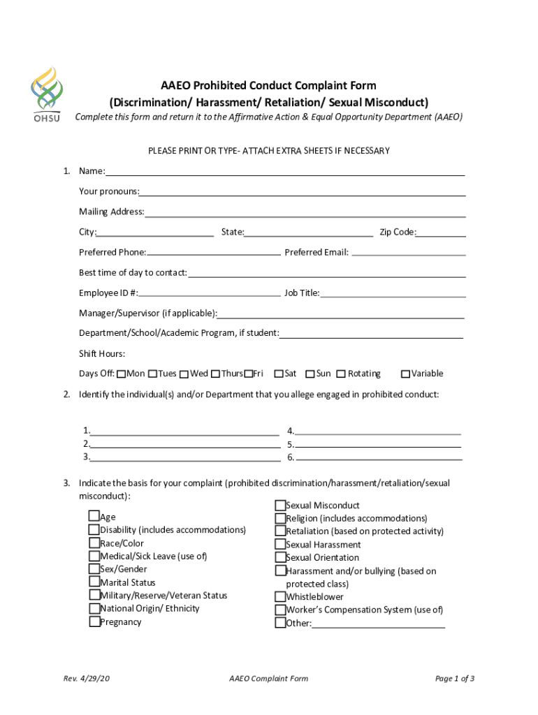 AAE Prohibited Conduct Complaint Form (Discrimination/ Harassment/ Retaliation/ Sexual Misconduct) Complete this form and return it to the Affirmative Action & Equal Opportunity Department (AAE) PLEASE
