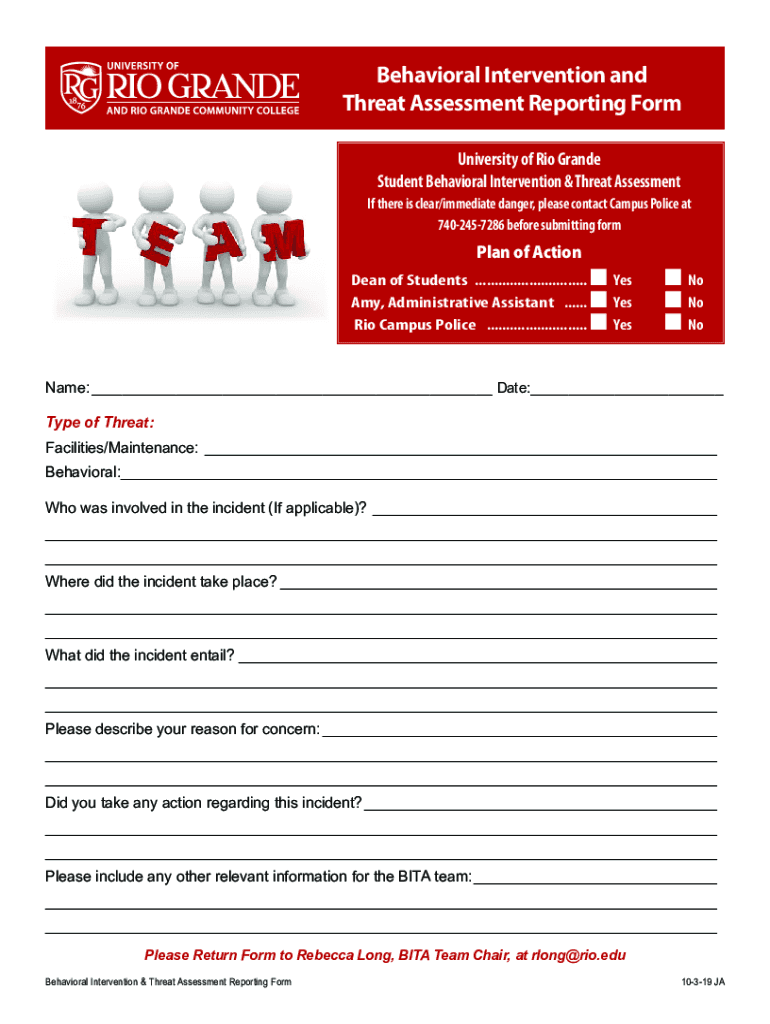 Behavioral Intervention and Threat Assessment Reporting Form University of the Rio Grande Student Behavioral Intervention & Threat Assessment If there is clear/immediate danger, please contact Campus