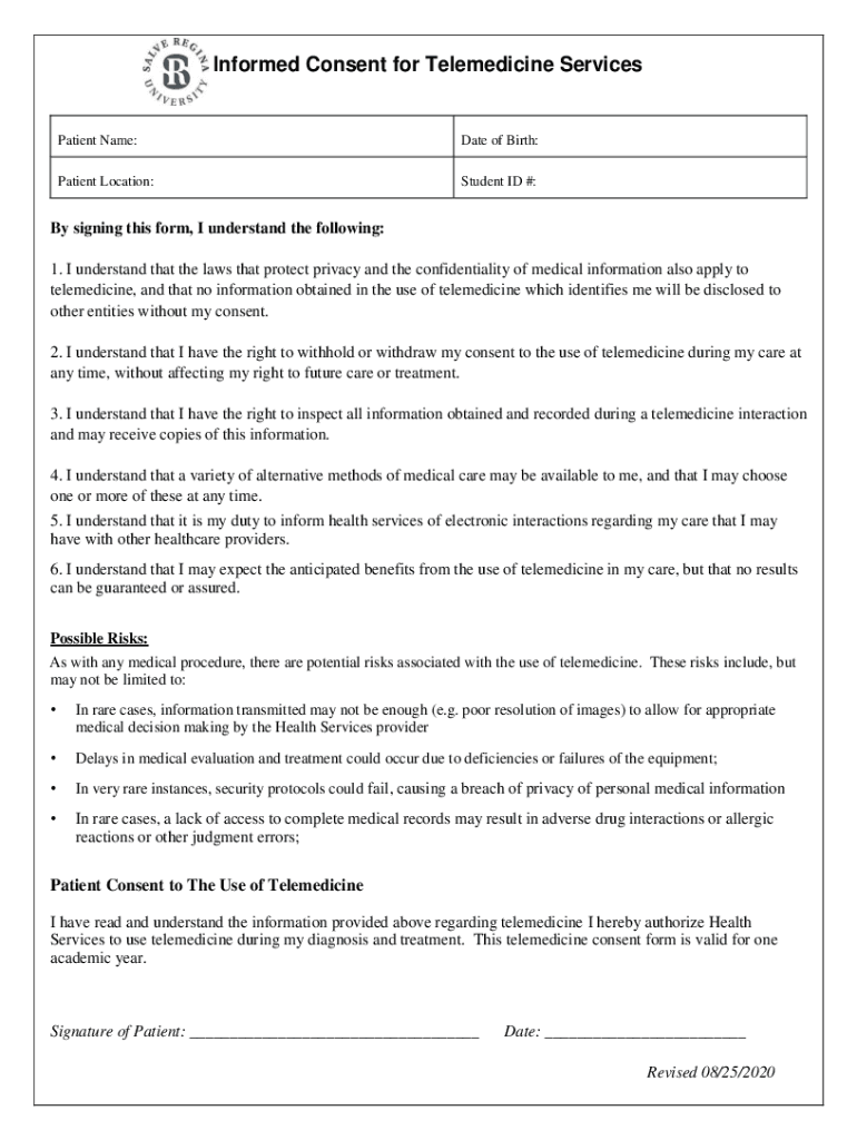 Informed Consent for Telemedicine ServicesPatient Name:Date of Birth:Patient Location:Student ID #:By signing this form, I understand the following: