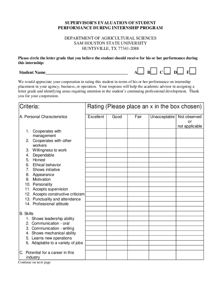 SUPERVISORS EVALUATION OF STUDENT PERFORMANCE DURING INTERNSHIP PROGRAM DEPARTMENT OF AGRICULTURAL SCIENCES SAM HOUSTON STATE UNIVERSITY HUNTSVILLE, TX 773412088 Please circle the letter grade that