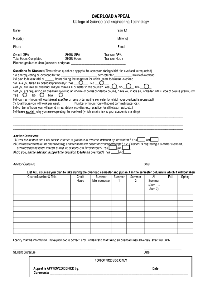 OVERLOAD APPEALCollege of Science and Engineering Technology Name Sam ID Major(s) Minor(s) Phone Email SHU GPA Transfer GPA Overall GPA Total Hours Completed SHU Hours Transfer Hours Planned graduation