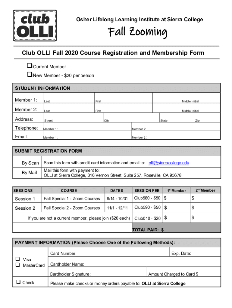 Other Lifelong Learning Institute at Sierra Collegial Zooming Club OLLIE Fall 2020 Course Registration and Membership Concurrent Member New Member $20 per person STUDENT INFORMATION Member 1:LastFirstMiddle