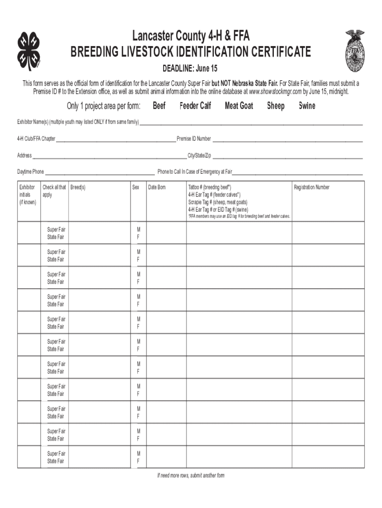Lancaster County 4H & FFA BREEDING LIVESTOCK IDENTIFICATION CERTIFICATE DEADLINE: June 15This form serves as the official form of identification for the Lancaster County Super Fair but NOT Nebraska