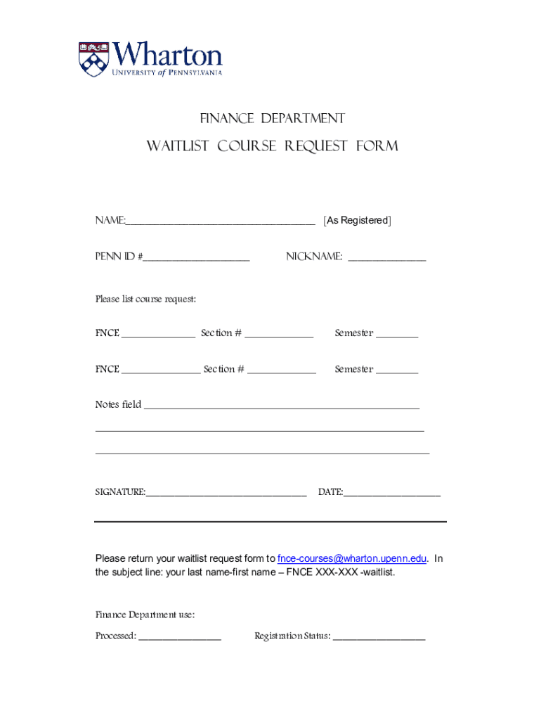 Get the free WAITLIST COURSE REQUeST FoRM - Finance Department - fnce wharton upenn