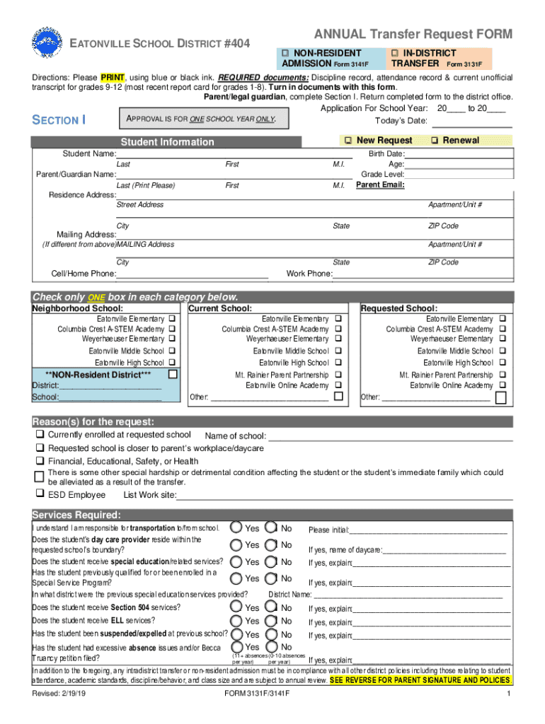 ANNUAL Transfer Request FORMEATONVILLE SCHOOL DISTRICT #404 NONRESIDENT INDISTRICTADMISSION Form 3141FTRANSFERForm 3131FDirections: Please PRINT, using blue or black ink. REQUIRED documents: Discipline