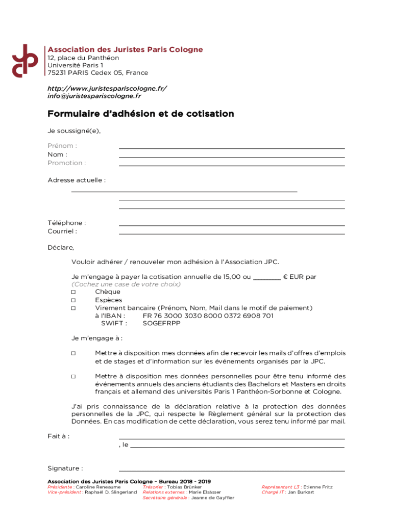 Association DES Jurists Paris Cologne 12, place Du Pantheon University Paris 1 75231 PARIS CEDEX 05, France http://www.juristespariscologne.fr/ info juristespariscologne.frFormulaire adhesion et de