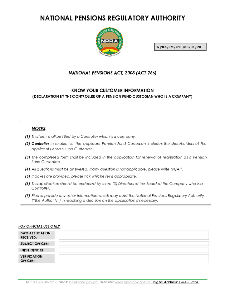 NATIONAL PENSIONS REGULATORY AUTHORITYNPRA/FM/KYC/06/01/20NATIONAL PENSIONS ACT, 2008 (ACT 766)KNOW YOUR CUSTOMER INFORMATION (DECLARATION BY THE CONTROLLER OF A PENSION FUND CUSTODIAN WHO IS A COMPANY)