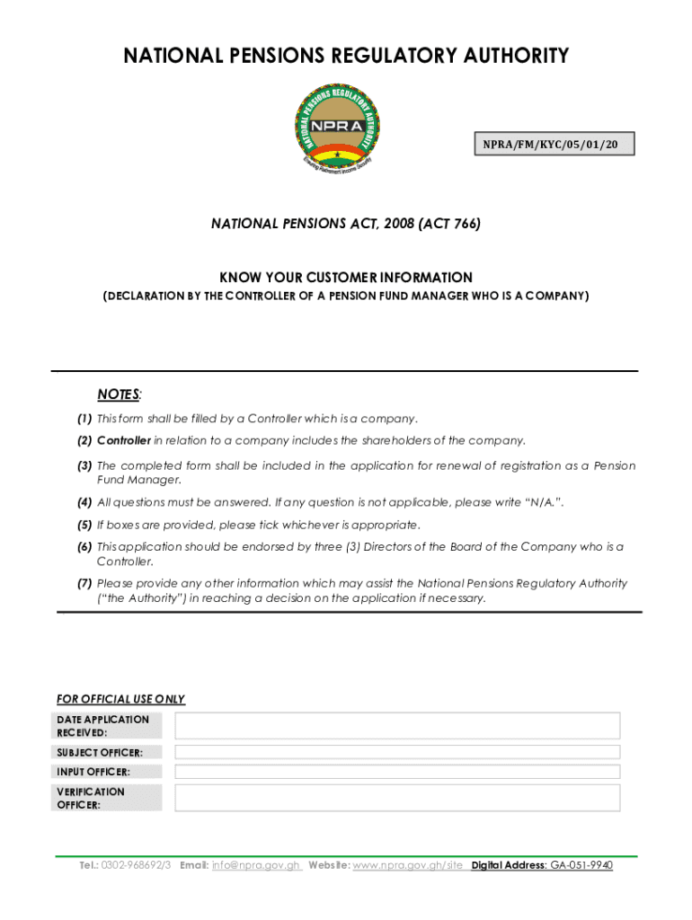 NATIONAL PENSIONS REGULATORY AUTHORITYNPRA/FM/KYC/05/01/20NATIONAL PENSIONS ACT, 2008 (ACT 766)KNOW YOUR CUSTOMER INFORMATION (DECLARATION BY THE CONTROLLER OF A PENSION FUND MANAGER WHO IS A COMPANY)