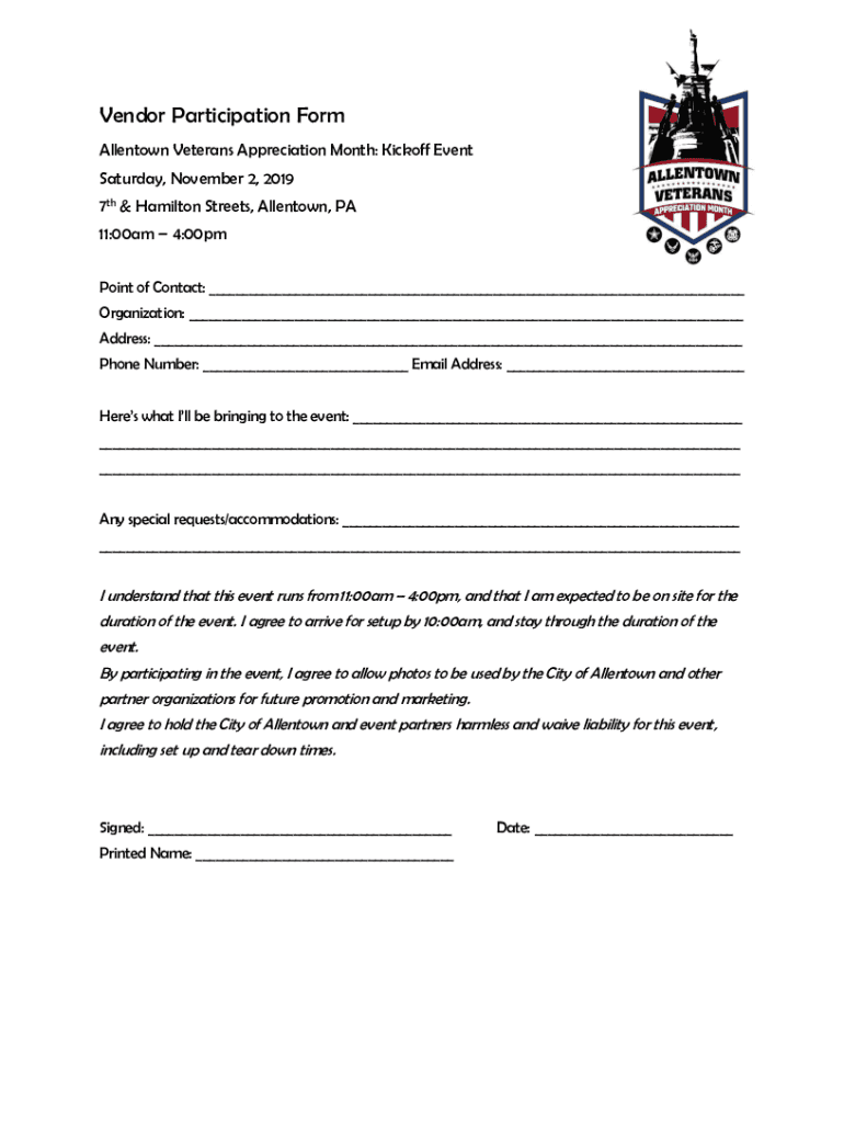 Get the free Vendor Participation Form - Allentown