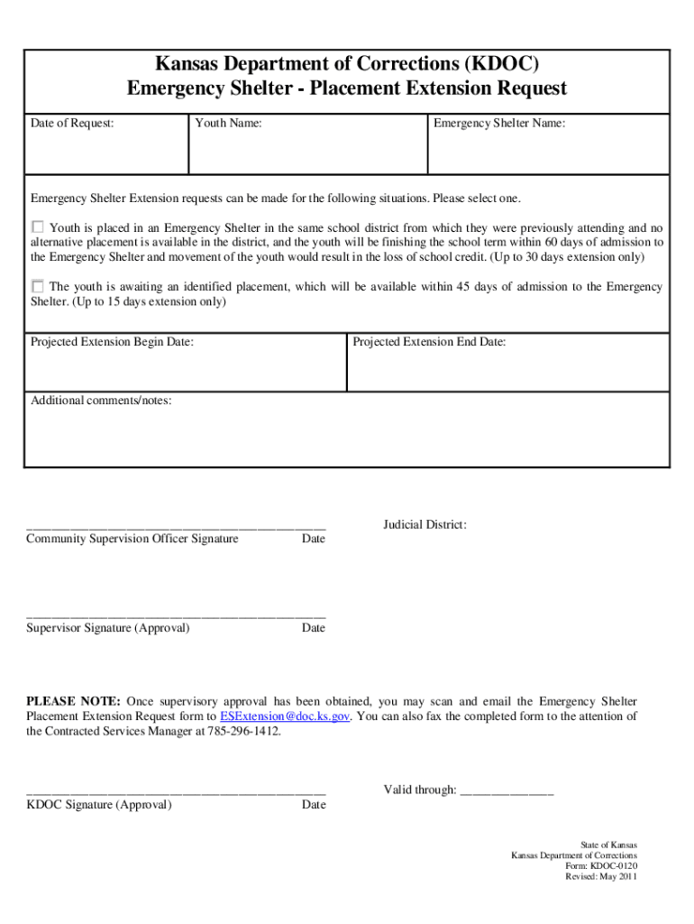 Get the free Form KDOC-0120 "Emergency Shelter - Placement Extension ...