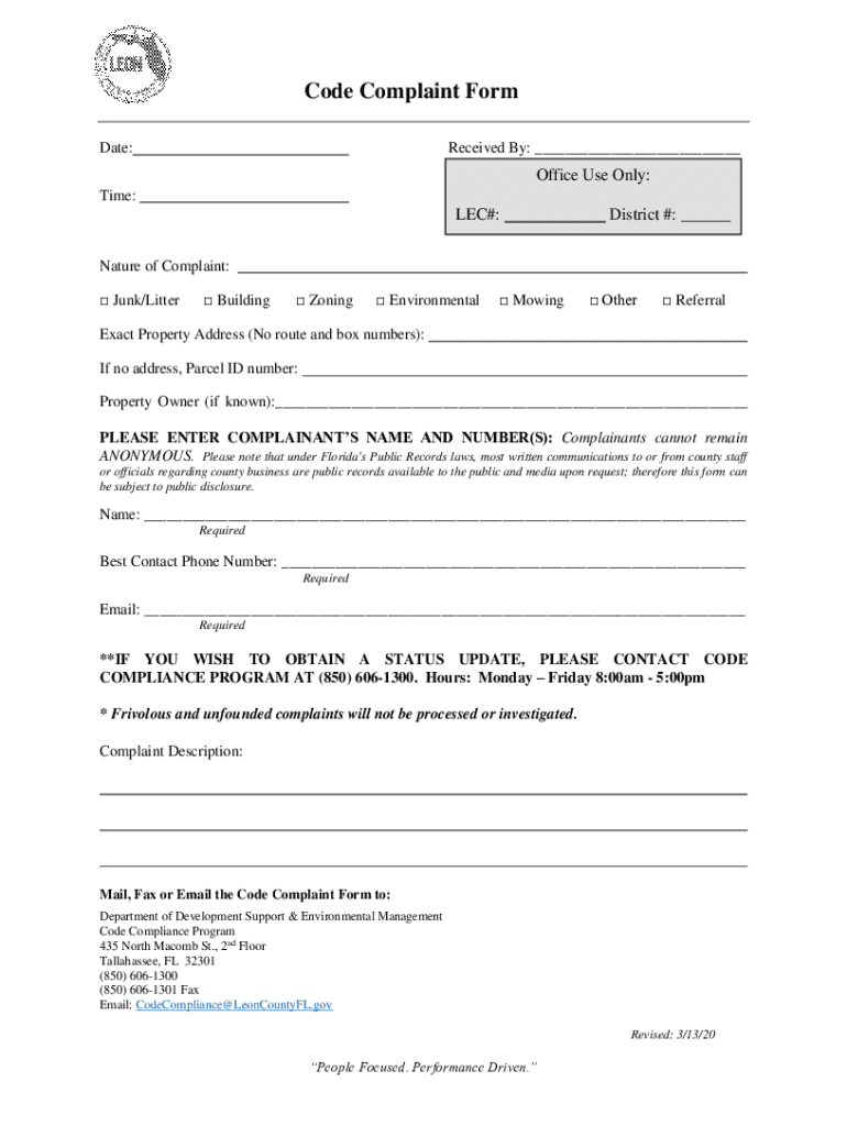 Code Complaint Form Date:Received By: Office Use Only: Time:LEC#:District #: Nature of Complaint: Junk/Litter Building Zoning Environmental Mowing Other ReferralExact Property Address (No route and