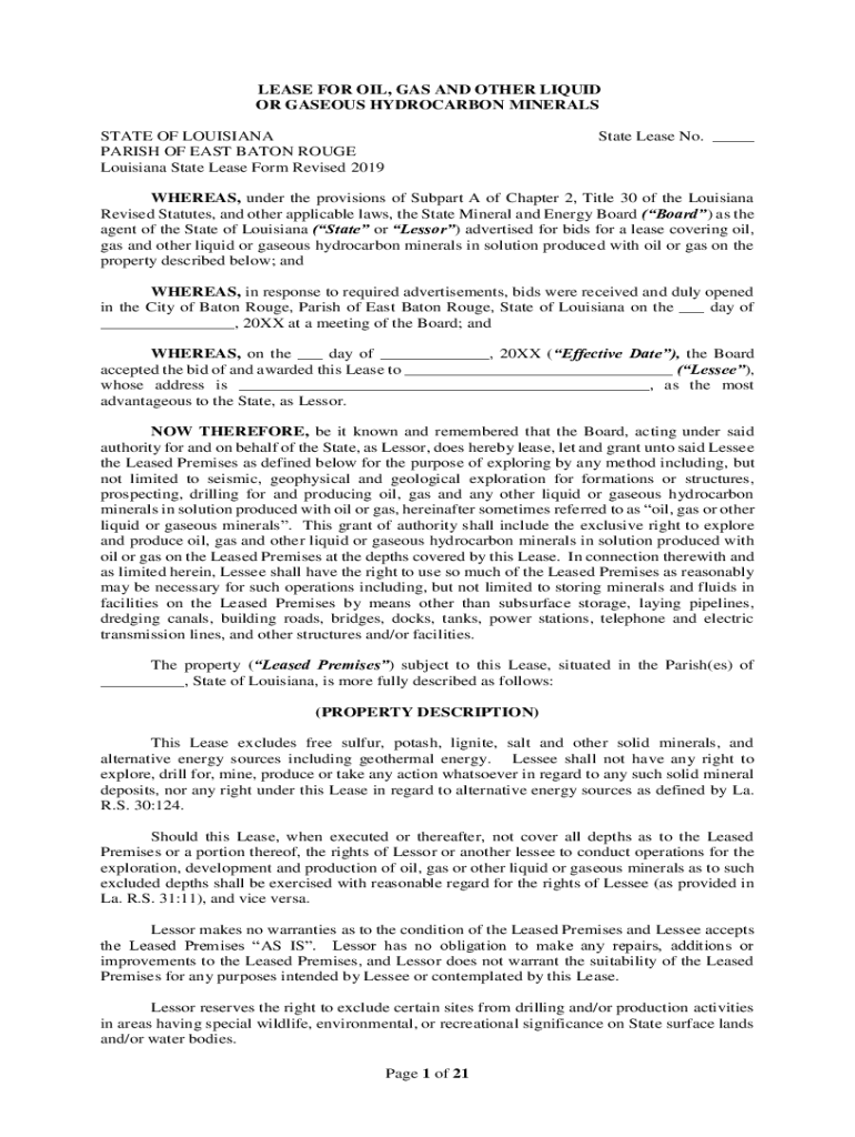 LEASE FOR OIL, GAS AND OTHER LIQUID OR GASEOUS HYDROCARBON MINERALS STATE OF LOUISIANA PARISH OF EAST BATON ROUGE Louisiana State Lease Form Revised 2019State Lease No. WHEREAS, under the provisions