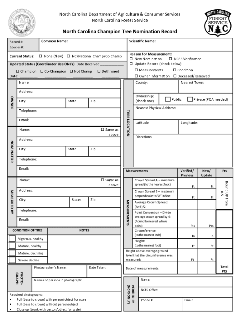 To fill out the nomination form for North Carolina champion trees, you will need to provide information about the tree's species, measurements, location, and other relevant details.