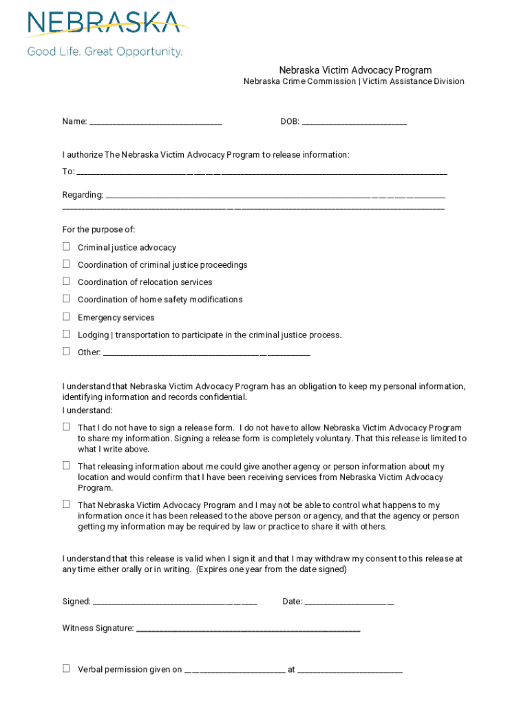 Nebraska Victim Advocacy Program Nebraska Crime Commission Victim Assistance Divisional: DOB: I authorize The Nebraska Victim Advocacy Program to release information: To: Regarding: For the purpose