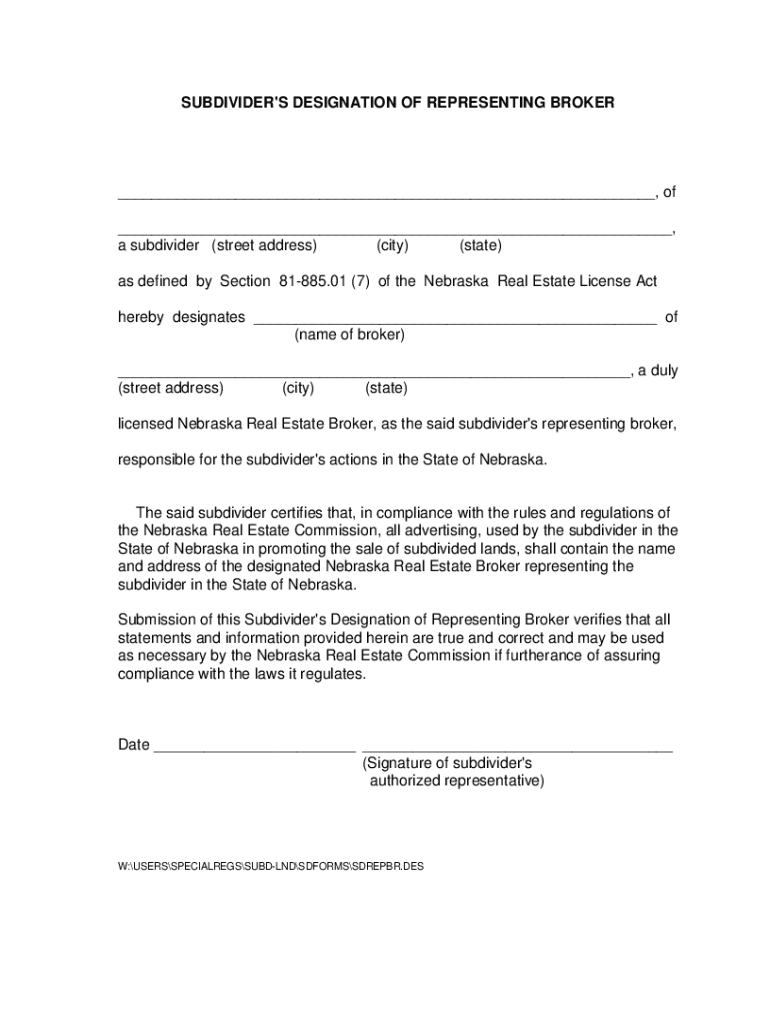 SUBDIVIDER IS DESIGNATION OF REPRESENTING BROKER, of, a subdivider (street address) (city) (state) as defined by Section 81885.01 (7) of the Nebraska Real Estate License Act hereby designates of (name