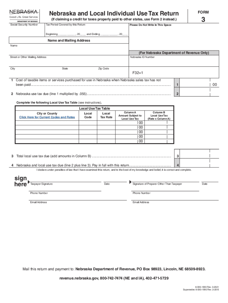 Nebraska and Local Individual Use Tax ReturnFORM3(If claiming a credit for taxes properly paid to other states, use Form 2 instead.) Social Security Number Period Covered by this ReturnBeginning,